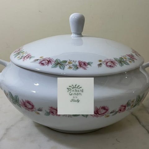 Vejl. pris 680 euro. Ny og værdifuld suppeterrin, mærke RICHARD GINORI 1735. Fremstillet i Italien. Med låg, original æske og udvendig etiket med stregkode og produktnavn for at bekræfte ægtheden. LAGO-formet model fra VANITAS-serien. Lavet af kinesisk benporcelæn. Produceret kort efter år 2000. Udgået af produktion og meget sjælden at finde ny eller brugt. Den rummer 3 liter. Denne serie er inspireret af mærkets traditioner fra det 18. århundrede, da markisen Carlo Andrea GINORI startede det, der senere skulle blive DOCCIA-fabrikken i landsbyen DOCCIA, Toscana, i familiens villa. Den er dekoreret overalt udvendigt i sølv. Dens listepris var 680 euro. Nu er den uopnåelig og yderst samlerværdig. Velegnet til samlere.