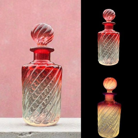 Et Baccarat krystal cylindrisk flakon med rødt overlay og sølvmontering i sterling 925, 16 cm højt, 6,5 cm i diameter, vægt 495 g, fra slutningen af 1800-tallet, Frankrig, i fremragende stand. Klik på den blå "gå til varen" knap, for at købe eller byde på denne vare. Den samlede pris vil blive vist inden du afgiver dit bud.
