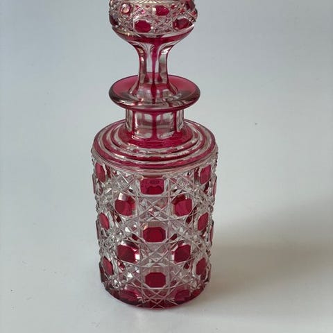 Cylinderflakon fra BACCARAT-fabrikken, i skåret krystal med rød overlay og sølvfatning stemplet sterling 925°/1000.