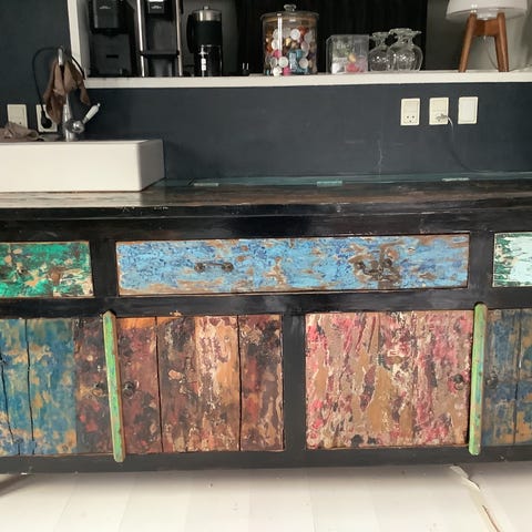 Skab Skænk fra Bali, lavet af ophuggede Fiskebåde i hårdttræ. Nypris 10000kr
