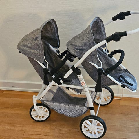 Beemoo tvillingeklapvogn med sele, punktfri hjul og stor indkøbskurv i rigtig fint stand.