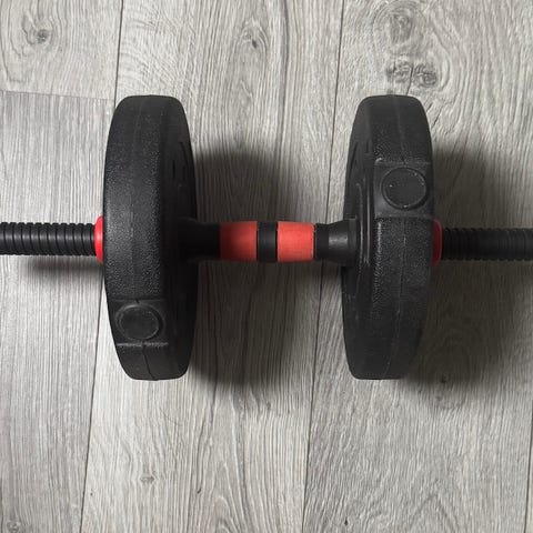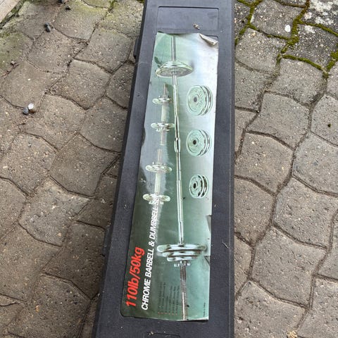 Sælges dette vægt sæt på 15 kg i det hele med to håndtag til håndvægte og en mitterstang til håndtagene så det bliver en lang stang , nypris 500 min pris 100 Kr