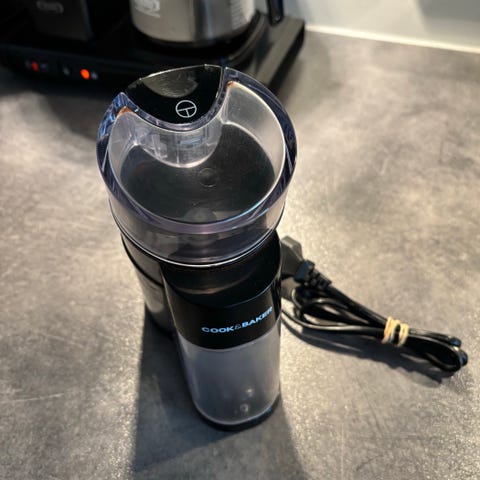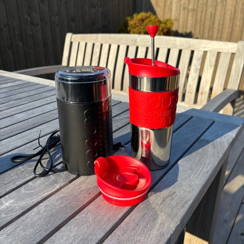 Cold Bruer Kværn og Termokande sæt i sort. Kværnen er designet til at male kaffe, og termokanden holder drikkevarer varme eller kolde. Begge dele har en sort finish og er velegnede til hjemmebrug eller til at tage med på farten.