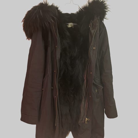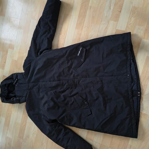 Parkaen er ca. 80 cm bred fra hoften og ned.