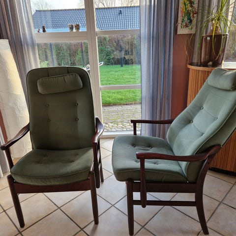 2 lækre Farstrup stole i Teak22 og med lyst stof - og med fodskammel med vip.