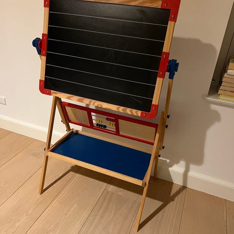 IKEA børnetavle med både kridttavle og whiteboard overflade. Tavlen har en ramme i træ og inkluderer en holder til papir, hvilket gør den egnet til kreative aktiviteter og læring for børn.