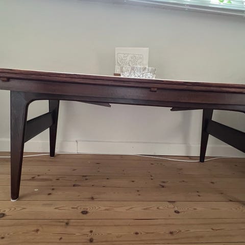 Det kan trækkes ud og op, så det kan fungere både som sofabord og som spisebord. Genialt til det lille hjem.