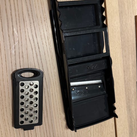 Dette er et mandolinjern i metal med flere udskiftelige blade til at skære og rive forskellige typer mad. Sættet indeholder et hovedmandolinjern samt fire forskellige blade med forskellige skærefunktioner. Bladene kan let udskiftes på hovedmandolinjernet, hvilket muliggør fleksibilitet ved madlavning og forberedelse af ingredienser. Størrelsen på mandolinjernet er 35,5 cm i længden.