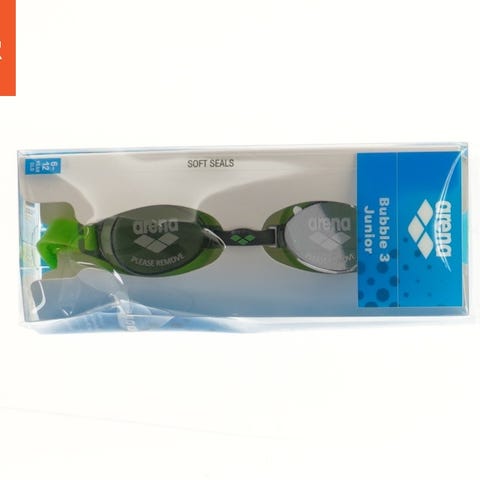 Et par oppustelige svømmearmbånd med et farverigt design, der inkluderer en fisk og sol. Armbåndene er lavet til børn i alderen 3-6 år og har en sikkerhedsinstruktion på bagsiden, der anbefaler fuldstændig oppustning for korrekt brug. De er blå med et klart plastikmateriale til at holde luft inde.