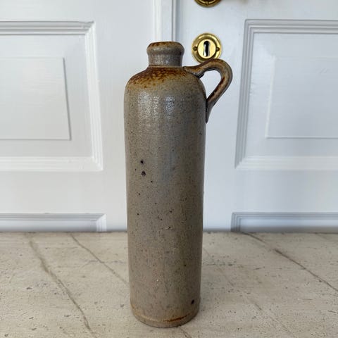 Lerdunk, 24 cm høj med hank. Den har en sort glaseret overflade, der virker sølvglinsende ned mod det nederste område afhængig af belysningen. Den kom fra Fyn til København omkring 1935 og er brugt til pynt på bogreol ferne med et par tørre kornaks og græsser