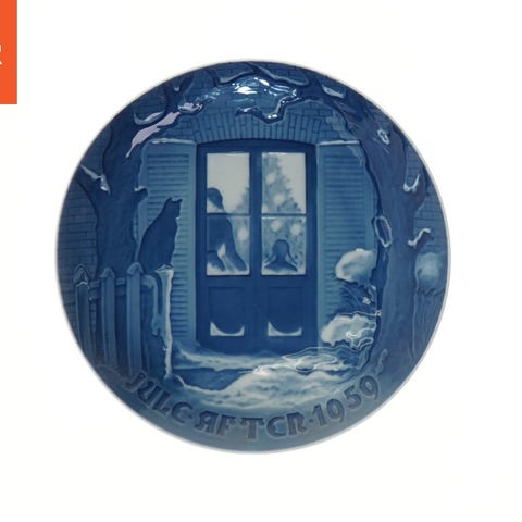 Dette er en dekorativ juleplatte fra 1976 med en diameter på 18,2 cm. Den har et motiv af en fiskerbåd i en havn omringet af traditionelle bygninger og kirker med juledekorationer og glade mennesker. På bagsiden er der et ophæng og tekst 'Genstand juleaften - Christmas Welcome'. Platte er lavet af Bing & Grøndahl, mærket er også tydeligt på bagsiden. Tags: juleplatte, Bing & Grøndahl, dekoration, samlerobjekt.