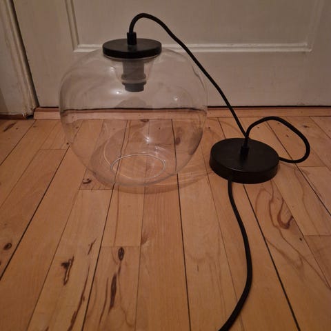 Dette er en stilfuld glaskugle pendel lampe med en simpel rund form. Lampen består af en transparent glaskugle, der fungerer som en lampeskærm, med en sort ledning, der hænger ned fra en sort base. Den er designet til at give et moderne udseende og kan passe godt ind i forskellige indretningsstile. Lampens størrelse er 20 cm i diameter.