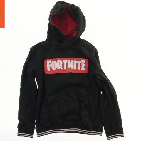 Hættetrøje i sort med Fortnite-logo. Den har lange ærmer og et tryk langs ærmerne. Trøjen har en hætte og er lavet af et blødt materiale.