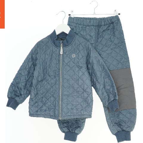 Et termosæt bestående af en jakke og et par bukser. Jakken har lynlås foran, ribkanter ved håndleddene og en lidt forlænget ryg. Bukserne har elastik i taljen og ribkanter ved anklerne. Begge dele er i marineblå farve med et kvadratisk quiltet mønster og lysere refleksdetaljer.