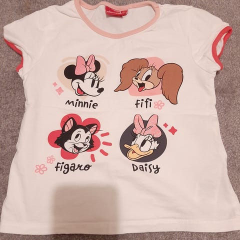 Kortærmet T-shirt med Disney motiver inklusive Minnie Mouse, Mickey Mouse, Daisy og Anders And. Blusen har en beige farve som basis og er pyntet med farverige detaljer på figurerne, såsom blå og grønne hatte og røde og rosa sløjfer.