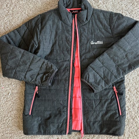 Jakken er grå med lyserøde detaljer ved kant og lynlåsen. Den har en høj krave, lynlås foran og lange ærmer. Jakken ser ud som den er lavet af et let materiale, ideel til mildt vejr.