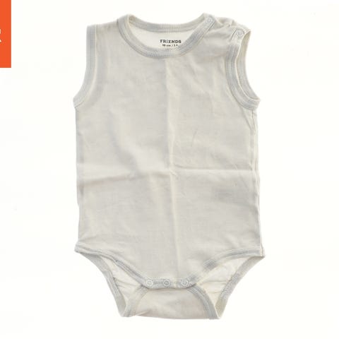 En hvid bodystocking med korte ærmer. Bodystockingen har trykknapper forneden og ved skulderen for nem påklædning og skift. Den er enkel i designet og lavet af blødt materiale for barnets komfort.