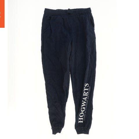 Grå bukser med elastik i taljen og ved anklerne. Bukserne er dekoreret med logo og illustrationer fra Harry Potter-universet, herunder husnavne som Gryffindor, Hufflepuff, Ravenclaw og Slytherin.