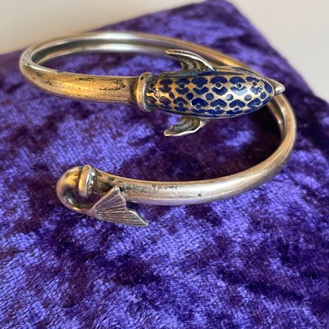 Denne armring er lavet af sølv og har et design med to delfiner, der mødes i midten. Armringen har en glat finish og en diameter på Ø 7 cm, hvilket gør den passende til de fleste håndled. Delfinmotivet giver smykket et nautisk og elegant udtryk. Tags: smykker, delfiner, sølv.