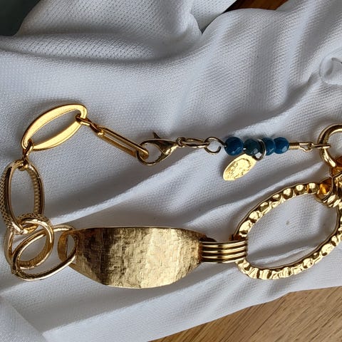 Dette armbånd er lavet af sort flettet materiale og har indbydende guldperler jævnt placeret rundt om armbåndet. Med en justerbar lukning er det designet til komfort og stilfuld anvendelse. Størrelsen på armbåndet er Ø 6 cm.