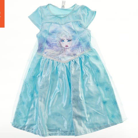 Denne børne udklædningskjole er inspireret af en populær Disney-karakter og kommer i en lyseblå farve. Den har lange ærmer og et glitrende mønster på brystet samt dekorationer nederst på kjolen og langs ærmerne. Der er en blålilla bånd omkring taljen med et snefnug motiv. Kjolen er ideel til udklædningsfester.