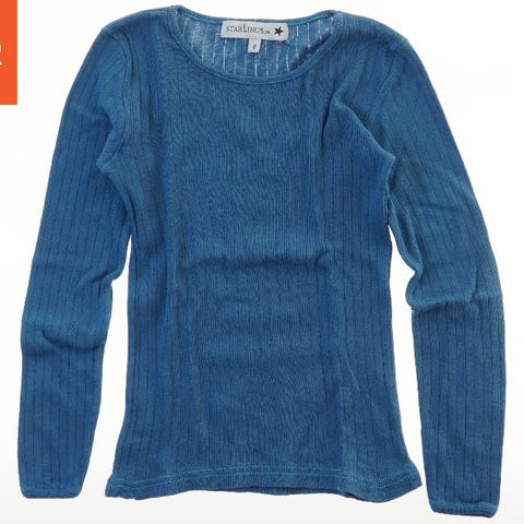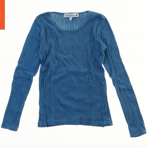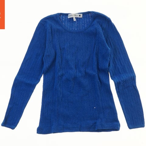 En langærmet bluse i blå farve. Blusen har ribstrikmønster og en rund halsudskæring. Den er lavet af et blødt materiale og har et enkelt design. Velegnet til hverdagsbrug.