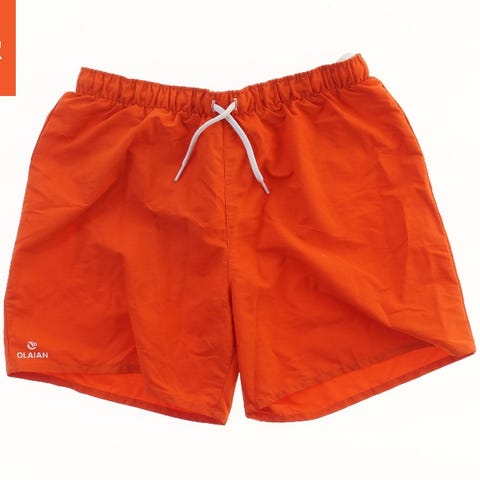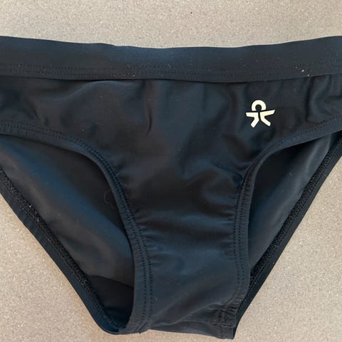 Et par blå badebukser med en hvid stribe langs siden. Der er et lille logo på forsiden.