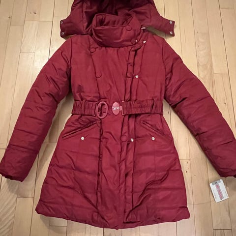 Vinterjakke i rødt med sorte detaljer. Jakken har en hætte og lynlås foran. Den er designet med to lommer foran. Ærmerne har sorte sektioner, som giver et flot kontrastlook. Jakken ser varm og komfortabel ud, ideel til kolde vinterdage. Kvalitetsmærket 'S' er placeret på forsiden af jakken.