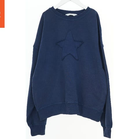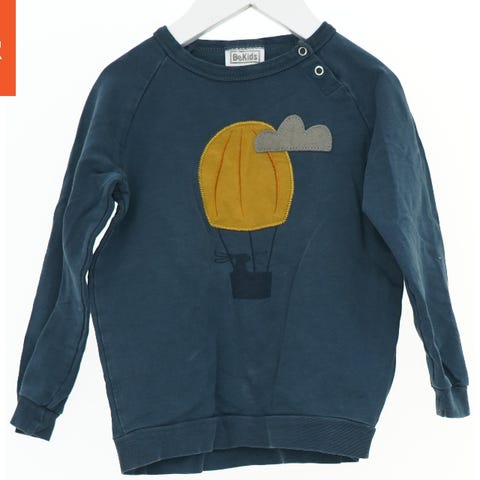 Denne børne sweatshirt er blå og har teksten 'OVER THE MOON' trykt foran med motiver af en raket og planeter. Den har lange ærmer med skrift på det ene ærme og en rund halsudskæring. Bagpå er sweatshirten ensfarvet blå.