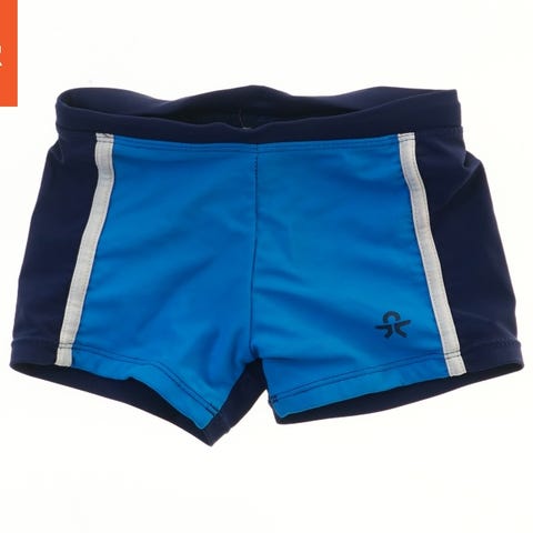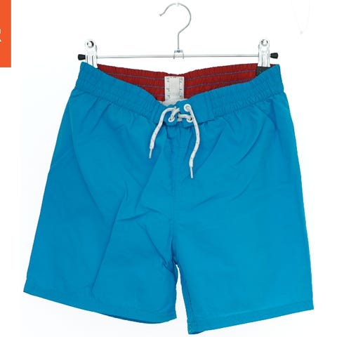 Et par orange badebukser med elastisk linning. De har en hvid snor til at stramme i taljen og en baglomme med en ventilationshul.