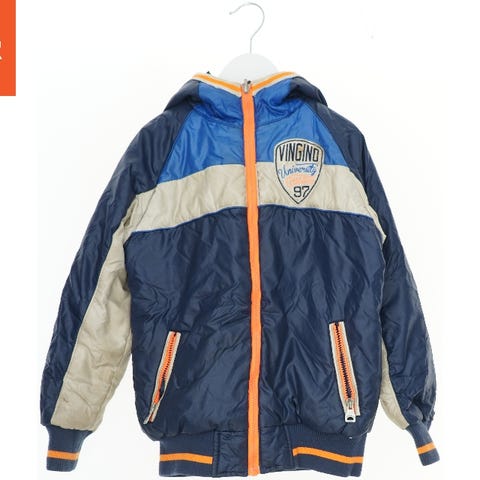 Denne jakke til børn har en mørkeblå farve med lysegrå striber på ærmerne. Jakken er udstyret med en lynlås foran og har to lommer med lynlås. Den har en hætte og en elastisk kant ved håndleddene, hvilket gør den velegnet til at beskytte mod vind. På ryggen ses et lille logo med teksten 'MEX'.