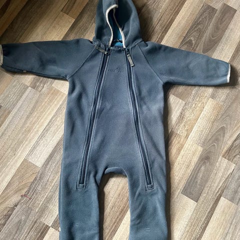 En mørkeblå heldragt til børn med lynlåslukning foran og to lynlåslommer på siden. Dragten har ribkant ved ærmerne og benene for bedre pasform, og der er elastik i taljen på bagsiden. Den er lavet af et robust materiale, egnet til kolde vejrforhold.