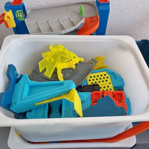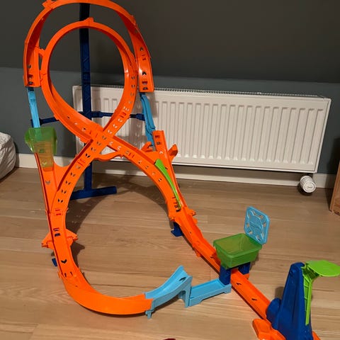Hot Wheels legetøj banasæt med farverige spor og loop. Sættet indeholder orange og grønne spor med blå støtteben, designet til børn til leg og racing med Hot Wheels biler.