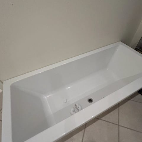 Dette badekar er i outlet, da det har en mindre kosmetisk mærke og har stået i et showroom. Det har aldrig været brugt. Det har et VP-sæt, Det er forboret til armatur.