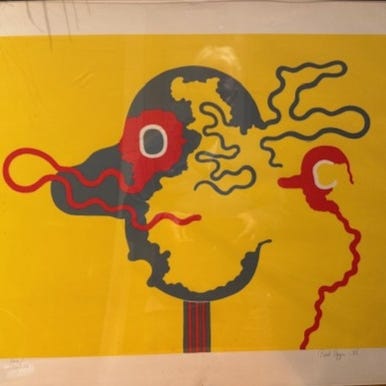 Paul Agger signeret kunsttryk med nummerering 718. Motiv i gule, røde og blå farver med abstrakt design. Printet er indrammet og signeret med årstal 76. Målene er 75 bred 63 høj