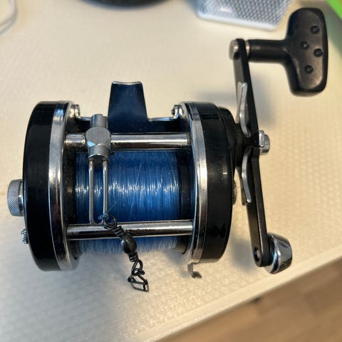 Ambassadeur Precision Spool fiskerulle med blå line, fremstillet i Sverige. Udstyret med Instant Anti Reverse funktion og metalhåndtag for præcis styring ved fiskeri.