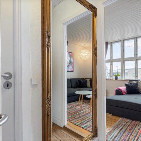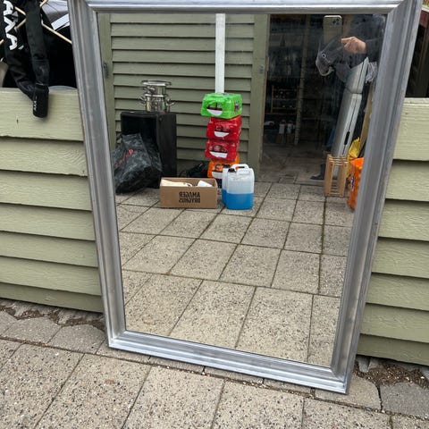 Jysk vægspejl med dekorative ornamenter i sølvfarvet ramme. Måler 72x162 cm