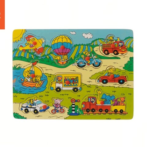 Ukendt børnepuslespil med mange farverige brikker i forskellige former og størrelser. Puslespillet indeholder elementer som containere, køretøjer og figurer, der kan bruges til læring og leg. Velegnet til børn til udvikling af finmotorik og problemløsning.