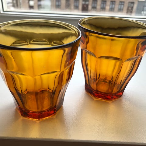Picardie glas fra Duralex, både farvede og klare: 2 blommefarvede, 2 gyldne og 2 klare. Alle i perfekt stand, H:9 cm, D:8½ cm.
