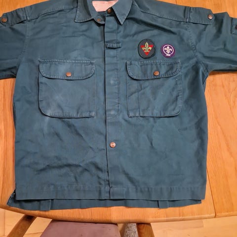 KFUM spejderuniform bestående af en jakke og en nederdel i grøn farve. Jakken har flere spejdermærker og patches på ærmet og brystet. Nederdelen matcher jakken i farve og materiale. Størrelse 40.