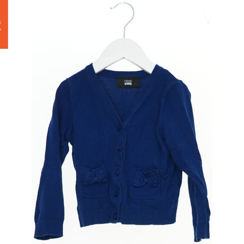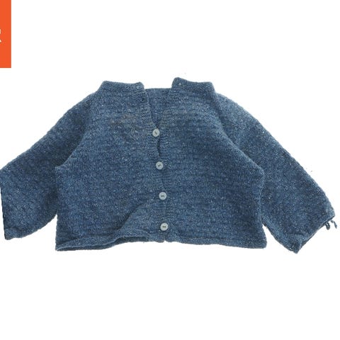 En børne cardigan i lys cremefarve med korte ærmer og knapper. Cardiganen har et dekoreret område på forsiden med et pink og blå design, som ligner et lille ansigt. Den er designet i et mønstret strikmønster, hvilket giver den et elegant udseende. Cardiganen er lukket med to små, ensfarvede knapper, og måler 43x37 cm.