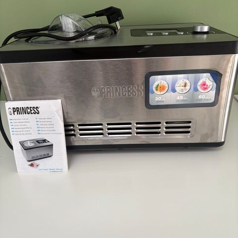 Princess Ismaskine. Maskinen har digitalt display og en beholder til isproduktion der kan tages ud og rengøres efter brug. Lidt brugsspor i skålen, men kun kosmetisk.