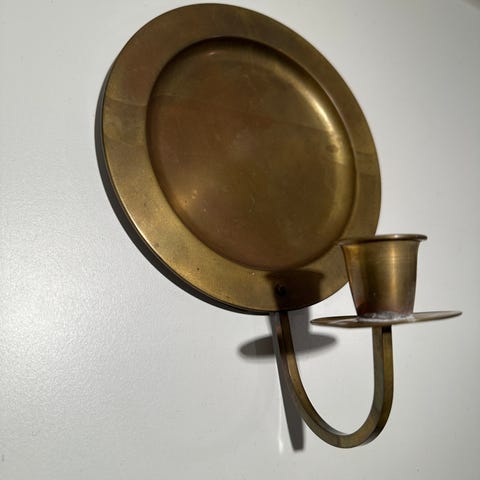 De smukkeste kæmpe store og sjældne vægstager i messing. De er gamle og fremstår i velholdt stand. Der er tilføjet ophæng af nyere dato på bagsiden, da det originale var slidt bort.