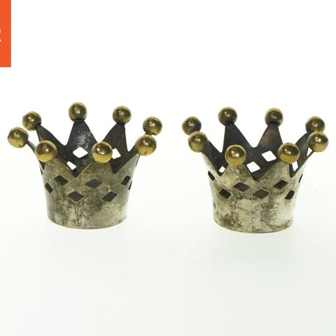 Disse to lysestager er udformet som små kroner og er lavet af metal med en sølv finish og gyldne kugler på spidserne. Lysestagerne er solide og har en diameter på cirka 8 cm og en højde på 5 cm. De er velegnede til standard fyrfadslys og kan tilføje et dekorativt element til ethvert rum.