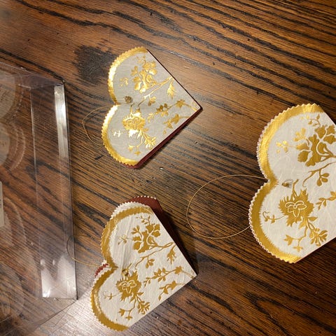 Et sæt af guld dekorationer fra Royal Copenhagen, formet som hjerter. Dekorationerne er indpakket i plast og har små fine guldsnore til ophængning. Perfekte til brug i hjemmet som dekorative elementer. Størrelsen af pakken er 21x7 cm.