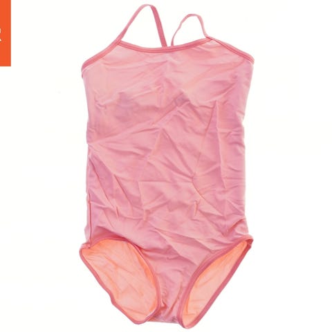 Badedragt med blomster mønster i lyse farver, primært lilla og gul. Den har flæsedetaljer ved skuldrene og benene.