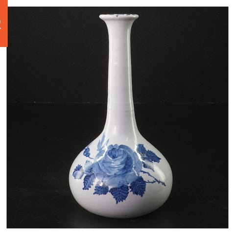 En lille keramisk vase med en diameter på 7,5 cm. Vasen har et abstrakt blåt mønster på en hvid baggrund og små håndtag på siden. Den er glaseret både indvendigt og udvendigt for en mere skinnende finish. Designet fremhæver dens kunstneriske udseende, hvilket gør den velegnet som en dekorativ genstand i hjemmet.
