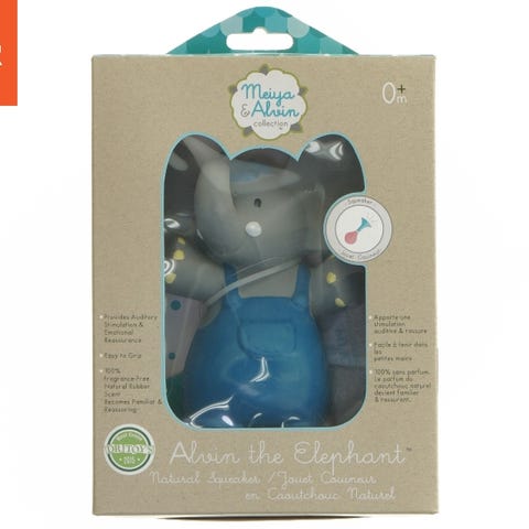 Meiya & Alvin naturskrald bamse, egnet til spædbørn fra 0 måneder. Den er lavet af naturligt og 100% duftfrit skrald gummi, som er designet til at give auditiv stimulering og emotionel tryghed for barnet. Emballagen indeholder både engelske og franske instruktioner og plejevejledning. Bamsen er designet til at være let at gribe og har en naturlig gummiduft, der bliver velkendt. Den er også modstandsdygtig over for fugt, og emballagen viser et sødt elefant tema.