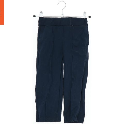 Mørkeblå træningsbukser med hvide striber langs siderne. Bukserne har en elastisk talje med snøre. De er lavet af blødt materiale og har en afslappet pasform.
