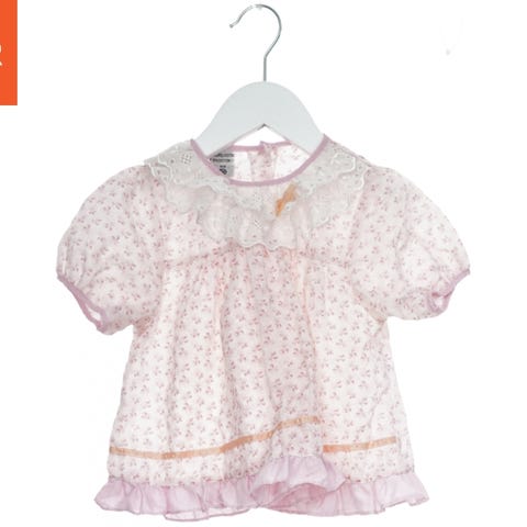 Et baby sæt bestående af en langærmet lyserød bluse dekoreret med flæser på skuldrene og et broderet ord nederst. Bukserne er lyserøde med et mønster af små hjerter. Bagsiden af blusen har lukning med to knapper. Bukserne har elastik i livet.